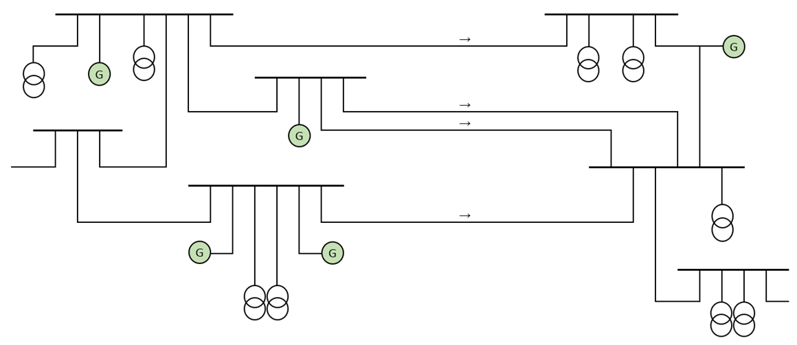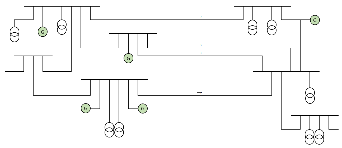 In den nachfolgenden Bildern ist eine schematische Darstellung eines Blackouts durch ein Ausfall einer Übertraungsleitung dargestellt.