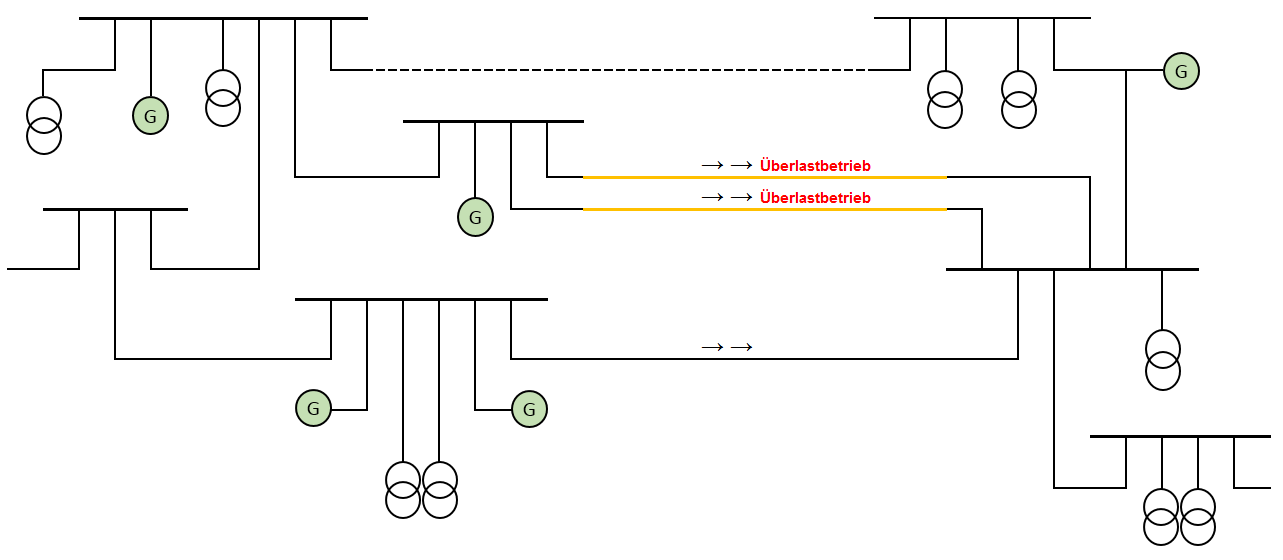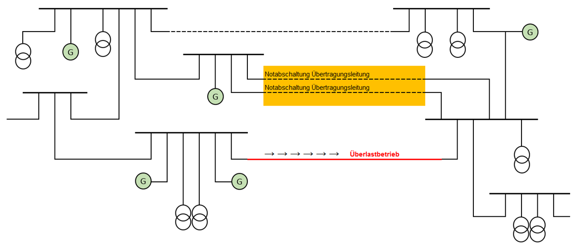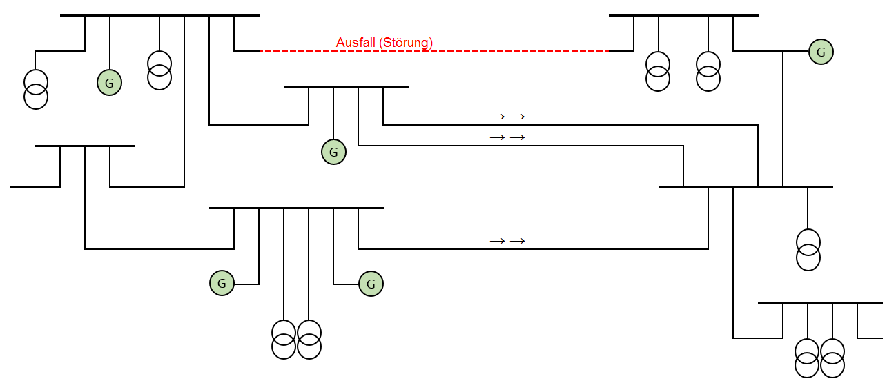 Die verbliebenen Übertragungsleitungen übernehmen die Last (und damit den Wirkleistungstransport Richtung Verbraucher)