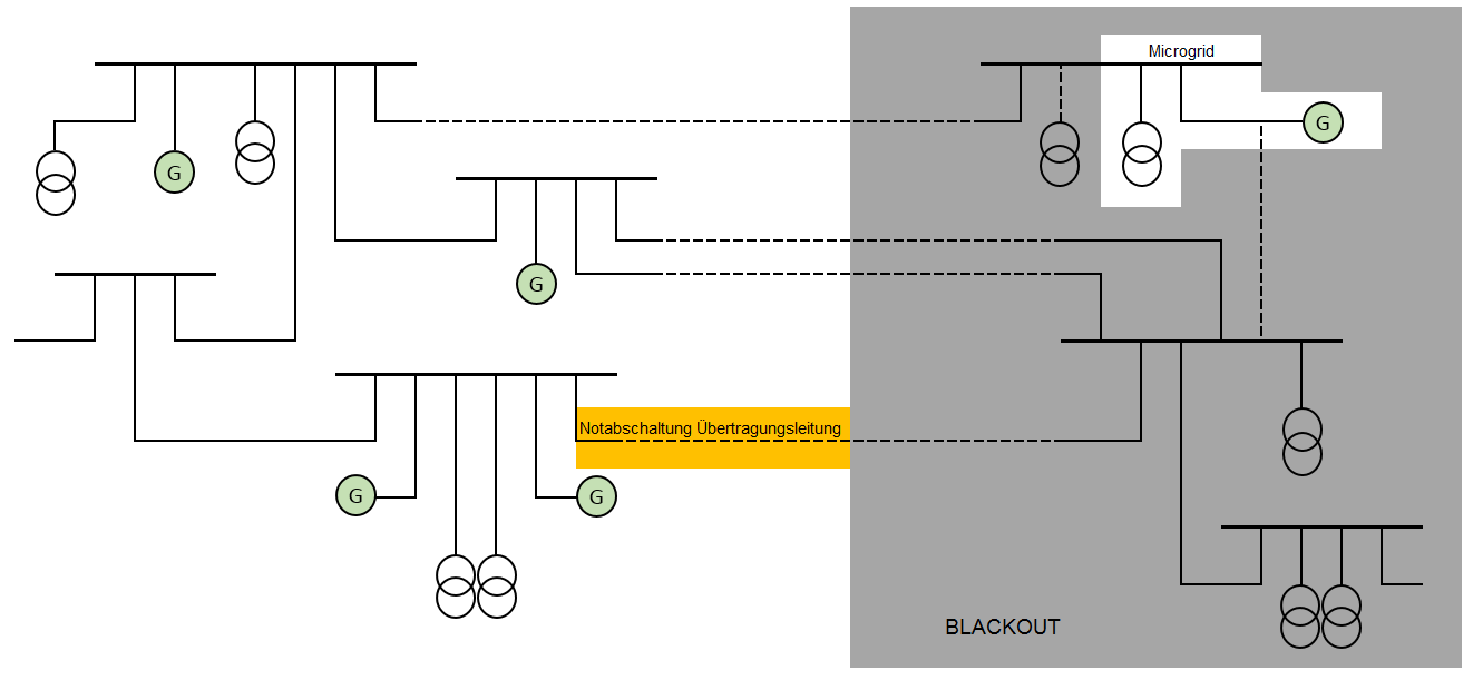 Das Netzgebiet im Blackout muss schrittweise wieder aufgebaut werden (nachdem die ausgefallene Transportleitung wieder entstört wurde) .