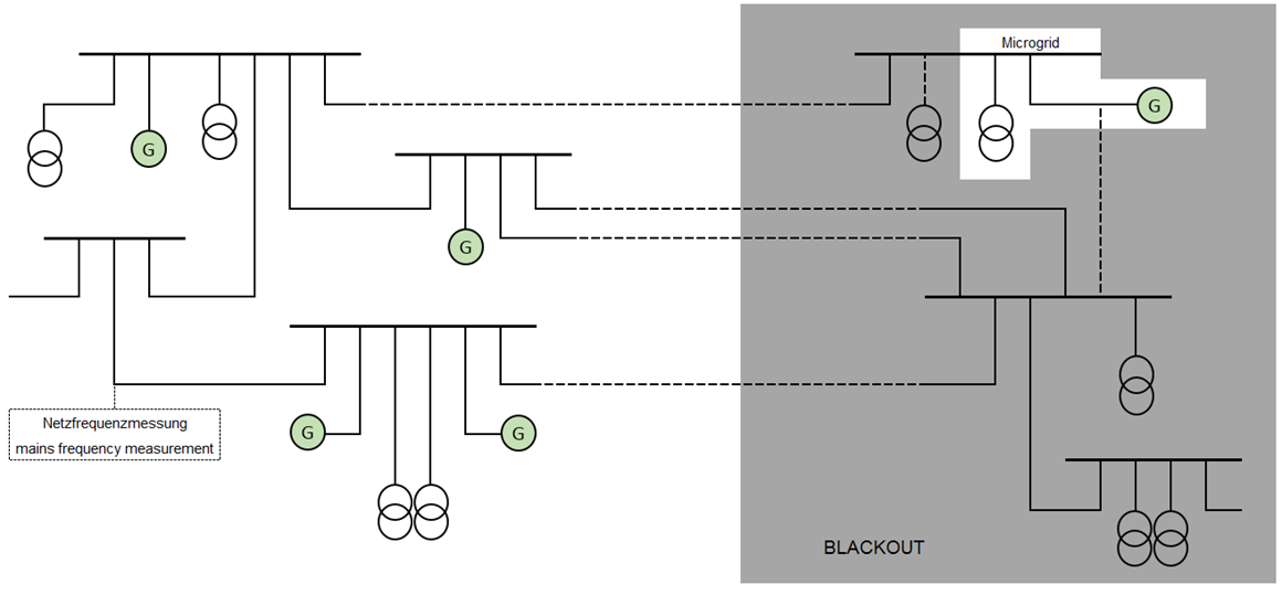 Im betroffene Netzgebiet entsteht ein flächendeckender Stromausfall. Möglicherweise fallen kleinere Versorgungsgebiete durch eine Netztrennung in einen Inselnetzbetrieb (Microgrid).