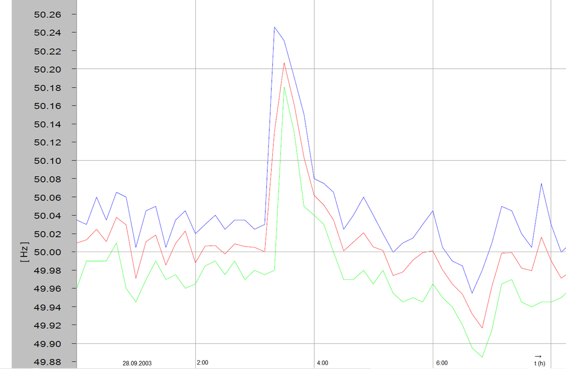 Netzfrequenz Blackout Italien 28-9-2003Bild : Netzfrequenzverlauf der Störung / Blackout in Italien (28.September 2003), Messort Wuppertal, Deutschland