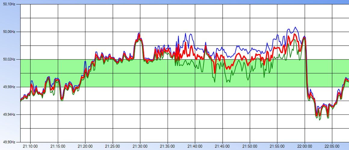 Bei einer normalen Netzmessung ist diese Erscheinung nicht immer sofort sichtbar. Meine Daueraufzeichnung, die die Max- und Min-Messwerte der Netzfrequenz erfasst und eine Mittelwertbildung beinhaltet, zeigt einen ungewöhnlichen Verlauf. Zu erkennen ist, dass eine Spreizung der Netzfrequenz-Max und Min-Werte den Beginn der Netzpendelung deutlich darstellen. Der plötzliche Abfall der Netzfrequenz gegen 22:00 Uhr ist wahrscheinlich durch eine Notabschaltung bei einem Fahrplanwechsel in einem Kraftwerk verursacht.